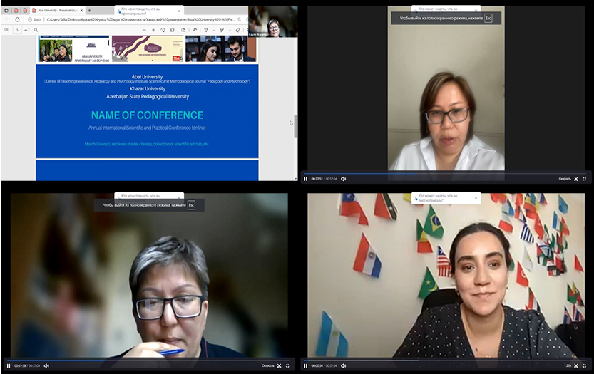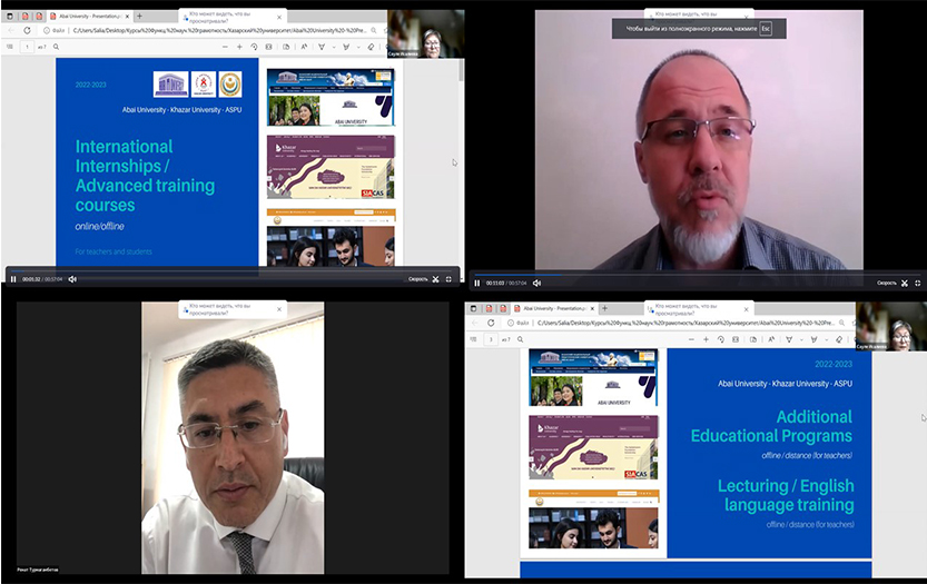 19 июля 2022 года в онлайн-формате состоялась встреча с представителями Хазарского университета и Азербайджанского государственного педагогического университета. В мероприятии приняли участие руководитель Центра преподавательского мастерства КазНПУ имени Абая Турмагамбетов Р.Ж., директор Института педагогики и психологии Абаева Г.А., заместитель главного редактора и ответственный секретарь научно-методического журнала «Педагогика и психология» Момбек А.А. и Исалиева С.Т.