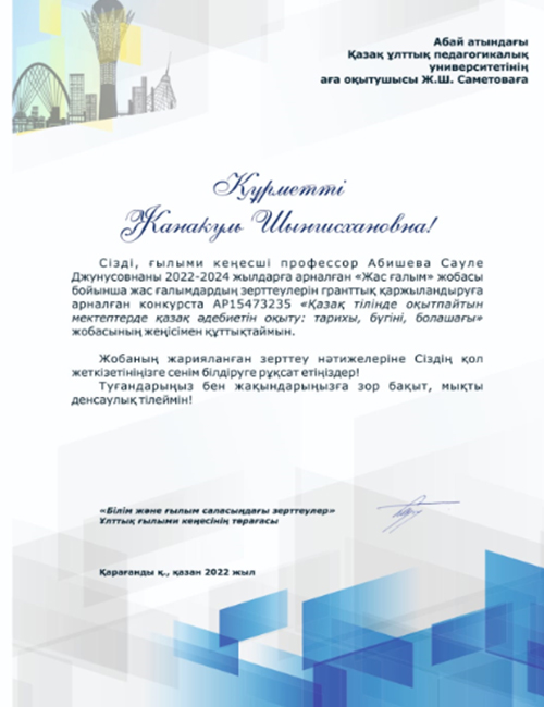 Постдокторант КазНПУ имени Абая Саметова Жанагуль под руководством заведующей кафедрой русского языка и литературы Института филологии, профессора Абишевой Сауле Джунусовны стала победителем конкурса Министерства науки и высшего образования РК на грантовое финансирование научных исследований молодых ученых по приоритетным направлениям развития науки на 2022-2024 годы по проекту «Жас ғалым».