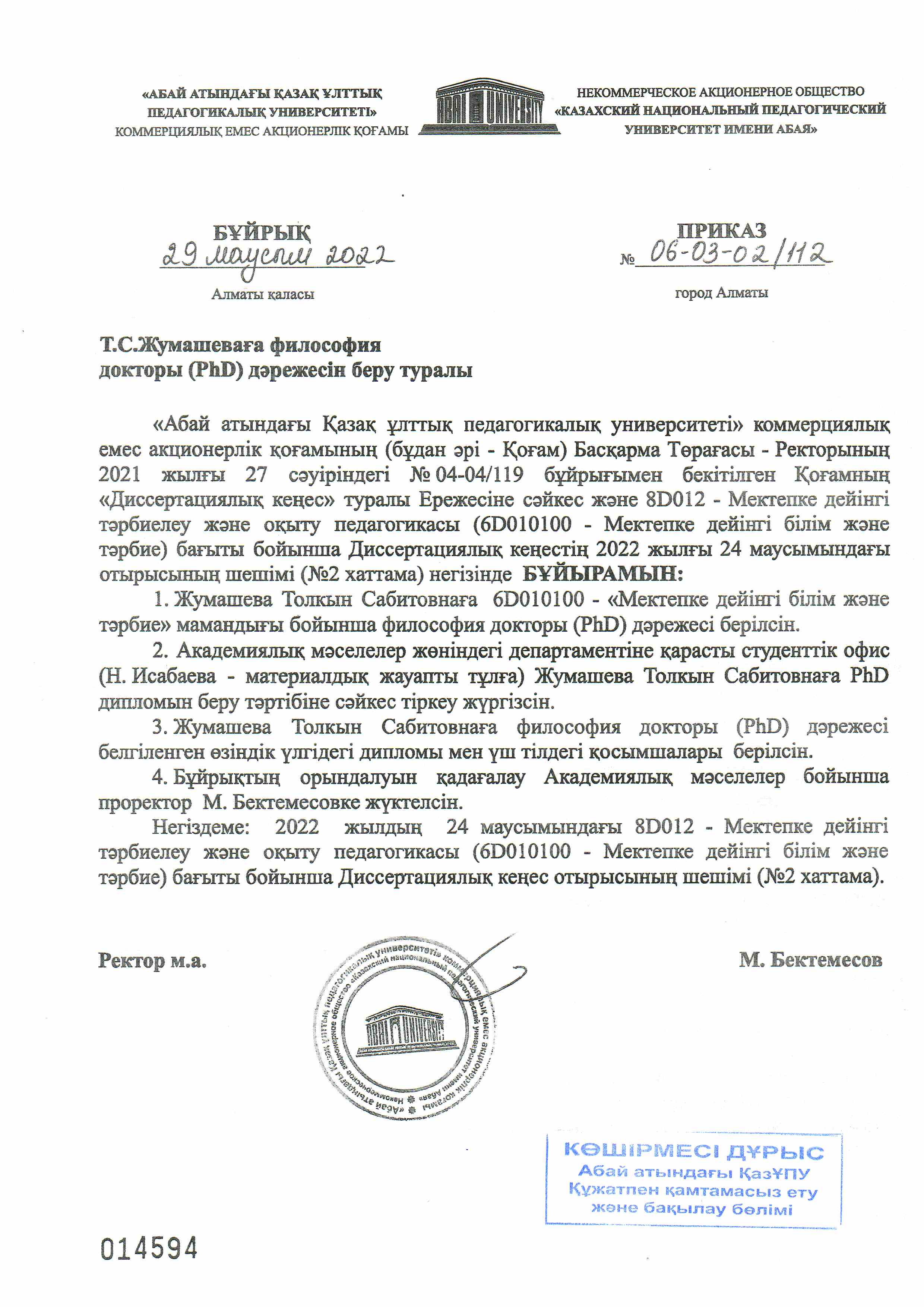 Защита состоится 24 июня 2022 года, в 11.00 часов в Казахском национальном педагогическом университете имени Абая. Адрес: 050010, г. Алматы, проспект Достык 13. Главный корпус (3-этаж, 320 кабинет) сайта: www.kaznpu.kz Контактный номер: +7(701) 718-06-85 Zoom: https://zoom.us/j/98893484124?pwd=ekFpNXNFeTZxTDhnei8xdWlPVmg3QT09