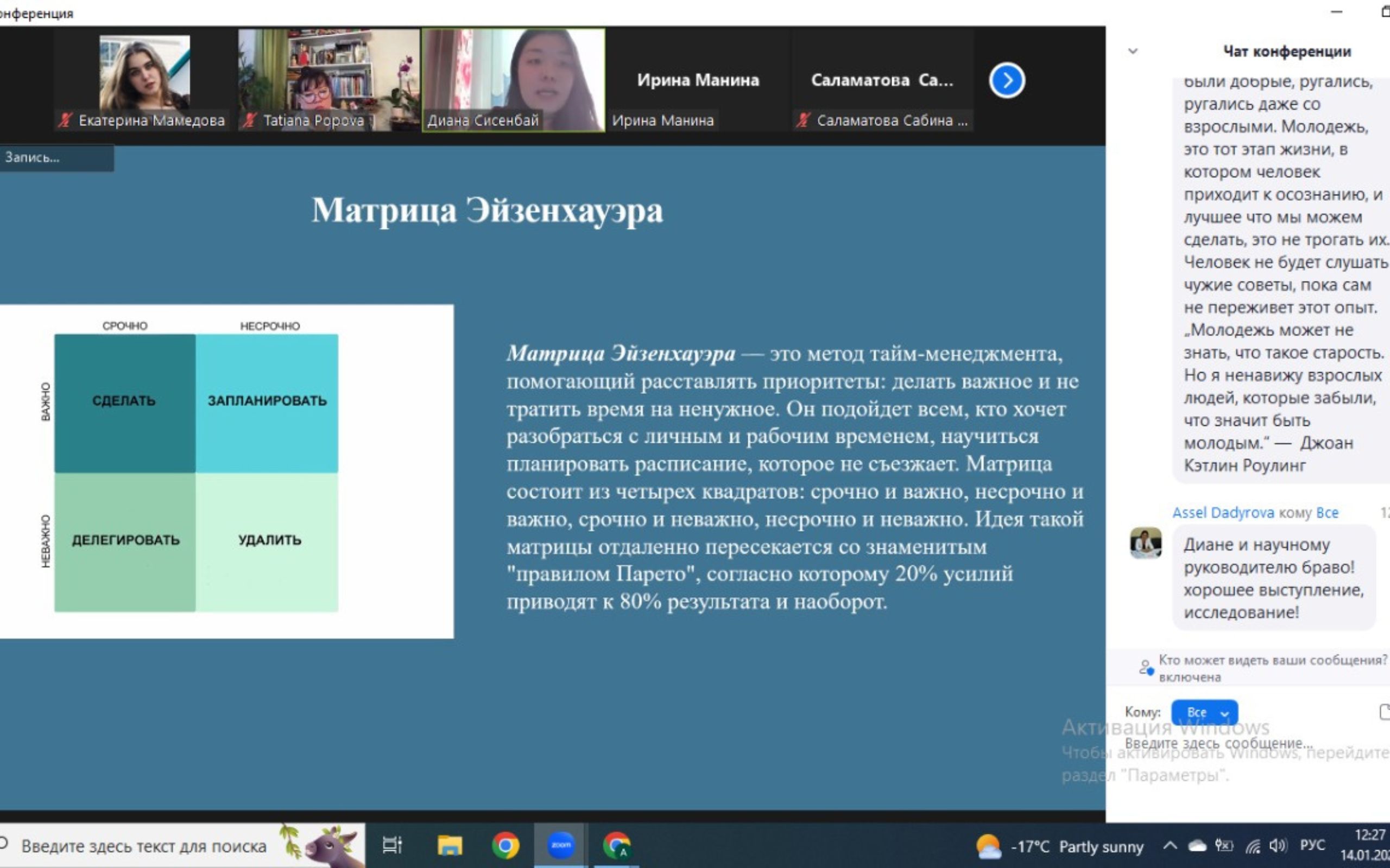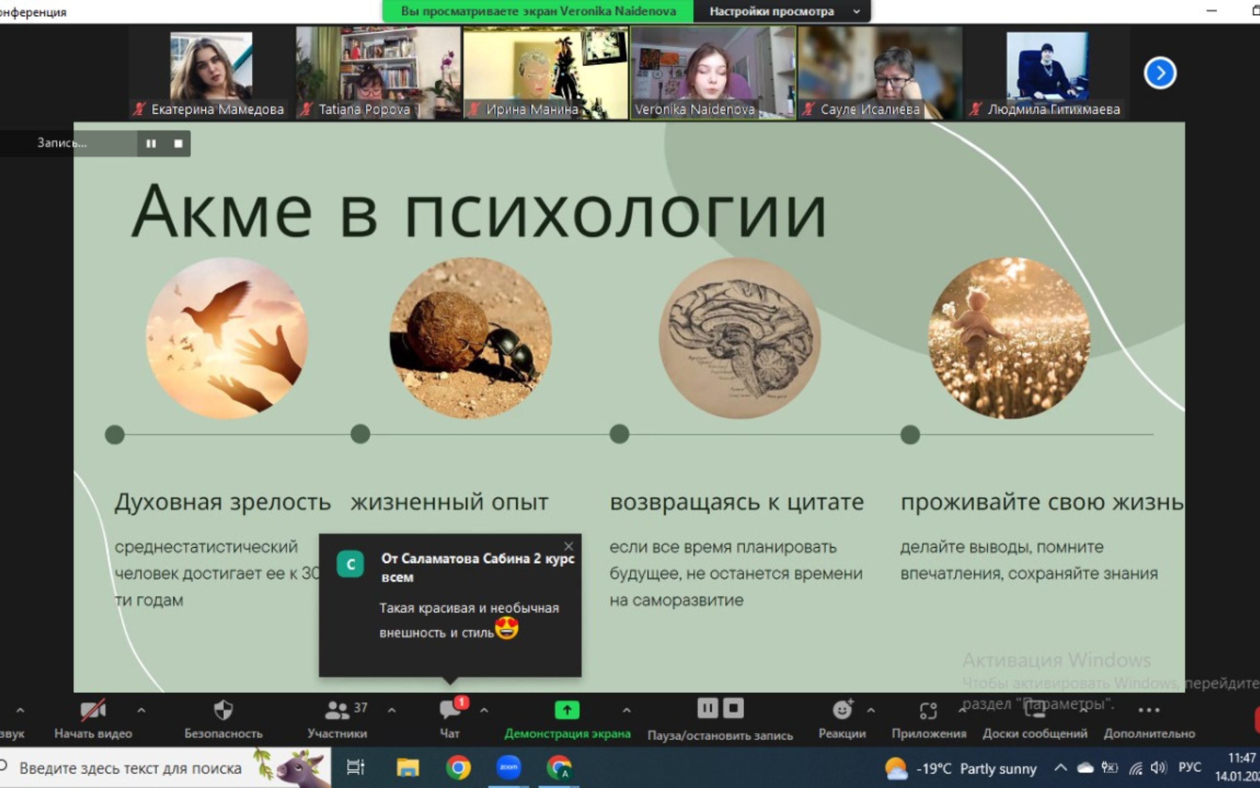 14 января 2023 года в г.Алматы в Казахском национальном педагогическом университете имени Абая в онлайн формате состоялась Седьмая Казахстанская молодежная секция XXVIII Международного симпозиума «Психологические проблемы смысла жизни и акме». Организаторами мероприятия выступили старший преподаватель кафедры педагогики и психологии Института педагогики и психологии КазНПУ имени Абая Исалиева Сауле, кандидат психологических наук, старший научный сотрудник ФГБНУ «Психологический институт» Российской академии образования (г.Москва) Попова Татьяна, при поддержке Городского научно-методического центра новых технологий в образовании Управления образования г.Алматы, Казахстанско-Российской специализированной школы-лицея № 54 имени И.В.Панфилова (г.Алматы).