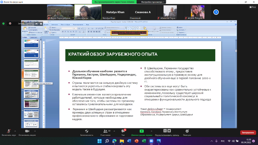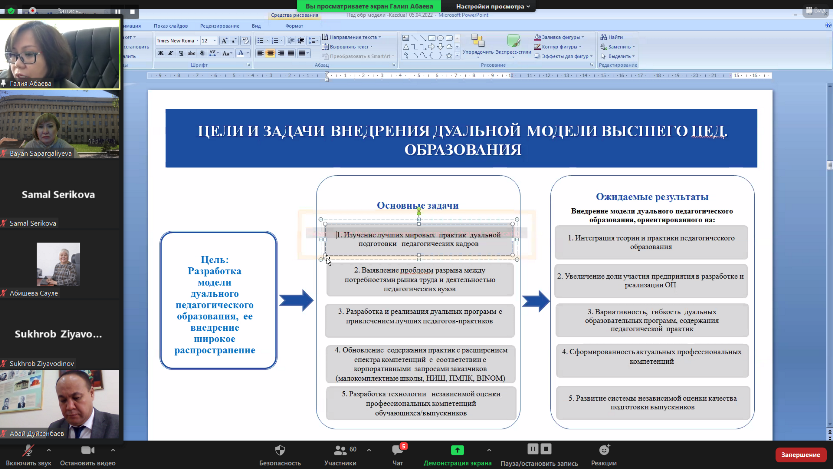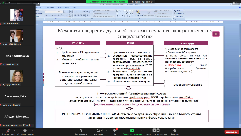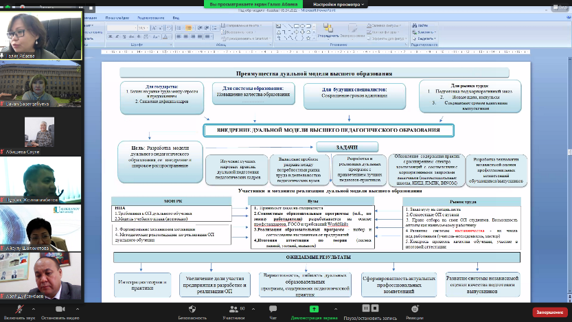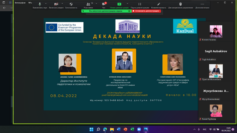 8 апреля 2022 года в рамках Декады науки и действующего Международного структурного проекта KAZDUAL «Внедрение дуальной системы в Казахстане», компонента «Повышение потенциала в области высшего образования (ППВО) программы ERASMUS+» в КазНПУ имени Абая состоялся Международный онлайн-семинар «Внедрение дуальной модели высшего педагогического образования в Казахстане».
