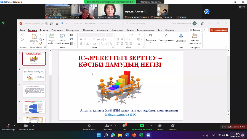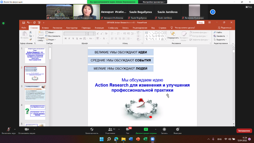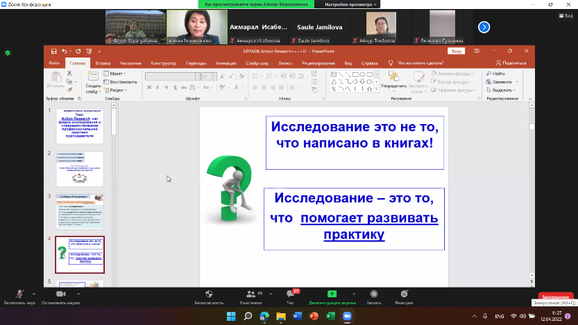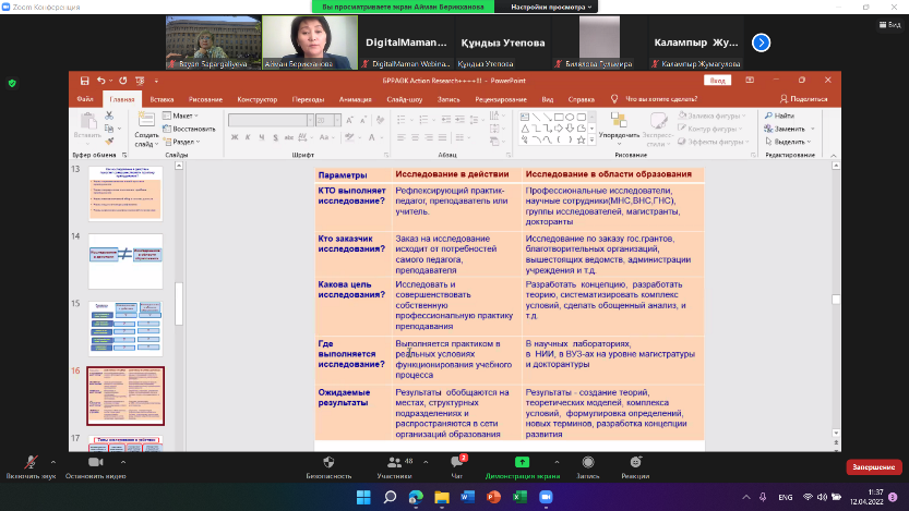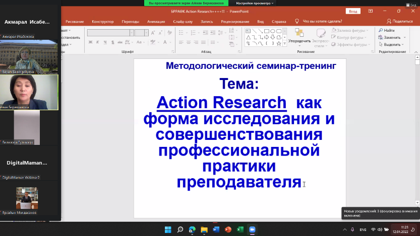 12 апреля 2022 года в рамках Декады науки КазНПУ имени Абая состоялся научно-методологический семинар «Action Research как форма исследования и совершенствования профессиональной практики преподавателя». Цель - усиление исследовательской активности преподавателей на основе внедрения Action Research.