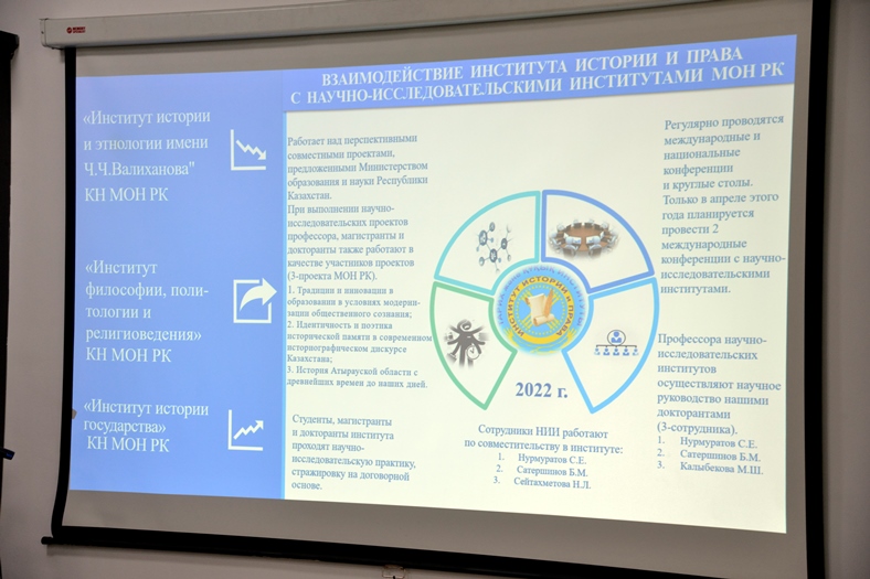 В мероприятии приняли участие проректор по исследовательской работе Е.Бурибаев, директор Департамента науки У.Абдигапбарова и руководитель Управления НИР и подготовки научных кадров Г.Баимбетова. О проводимой работе и проблемах рассказали директор Института истории и права А.Джунусов, Института педагогики и психологии - Г.Абаева, Института филологии - А.Танжарыкова.