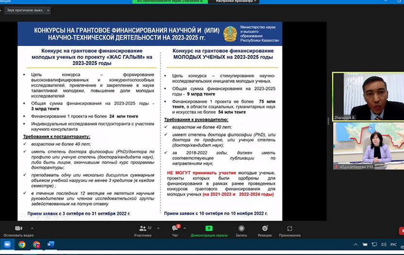 5 октября 2022 года состоялся вебинар «Консультации по конкурсной документации и оформлению заявок на грантовое финансирование научных исследований по проекту «Жас ғалым» МНВО РК» для докторантов КазНПУ им. Абая, закончивших полный курс обучения, но еще не защитивших диссертации, а также для молодых преподавателей, ученых, постдокторантов. Организатор - Департамент науки. В мероприятии приняли участие 55 молодых преподавателей.