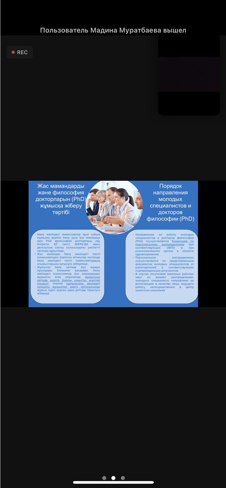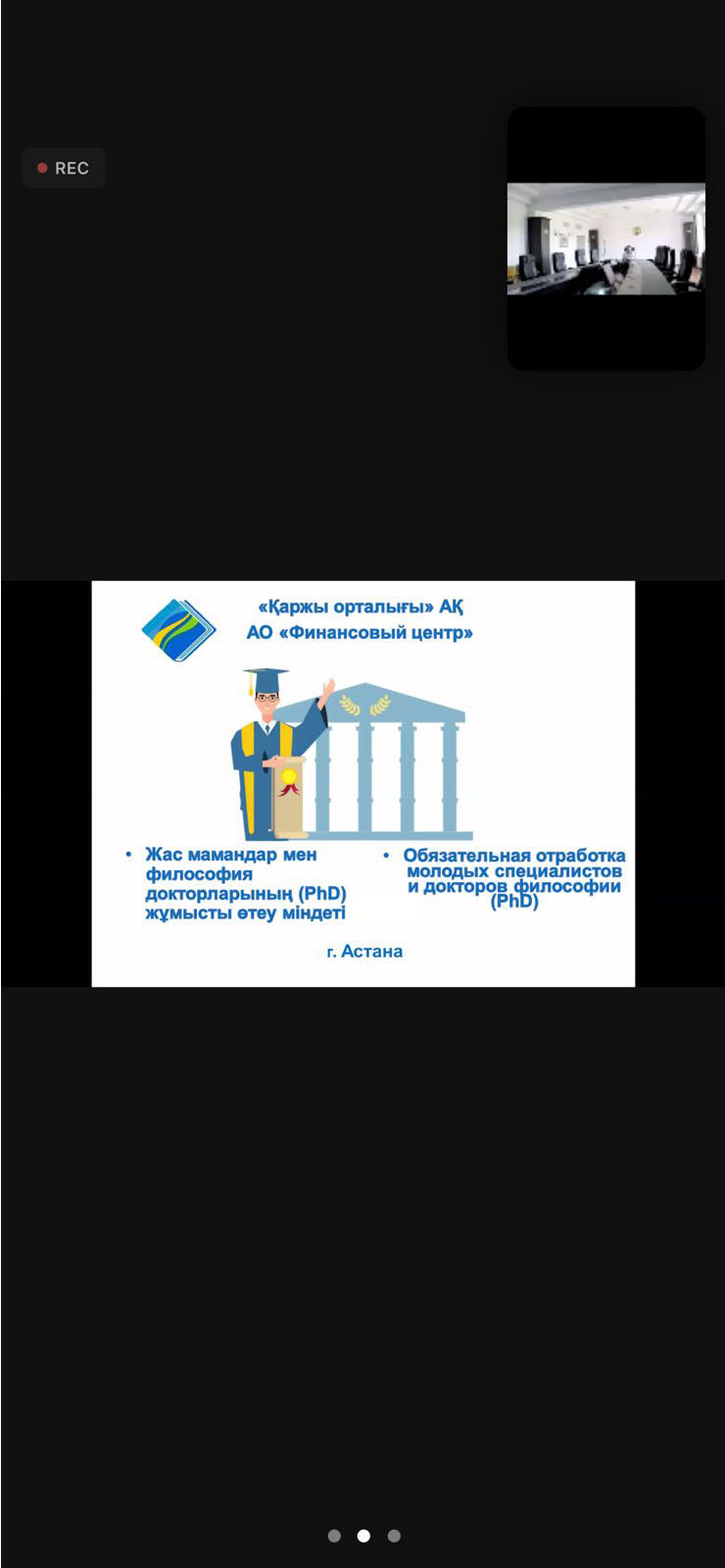 15 мая 2023 года специалист Центра «Карьера» КазНПУ имени Абая Байгутта Альфия провела онлайн информационную встречу с выпускниками (бакалавриат, магистратура, докторантура Phd) на тему «Обязательная трехлетняя отработка». В мероприятии приняла участие специалист Департамента мониторинга АО «Финансовый центр» Куралай Муратовна. Она рассказала о внесенных изменениях в Постановление №390 от 2012 года и провела разъяснительную работу, отметив важность темы для студентов, обучающихся по государственному образовательному гранту. Студенты задали вопросы, связанные с Постановлением Правительства РК №390 от 2012 года, и получили информацию о том, при каких условиях они будут освобождены от компенсации государственного гранта.