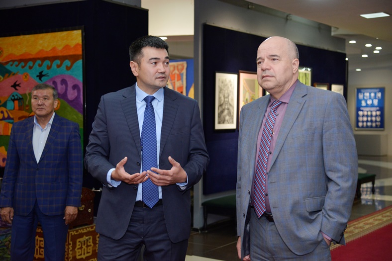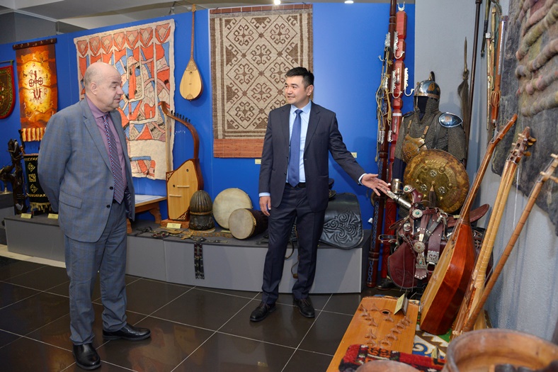 После встречи с председателем Правления-ректором КазНПУ имени Абая Дарханом Биляловым гости посетили музей, где ознакомились с историей университета, художественными произведениями, созданными мастерами-преподавателями Института искусств, культуры и спорта. Дархан Билялов лично провел познавательную экскурсию по музею, рассказал о смыслах картин и скульптур, ознакомил с декоративно-прикладным искусством (чии, войлоки), воинским снаряжением, музыкальными инструментами, предметами быта казахов.