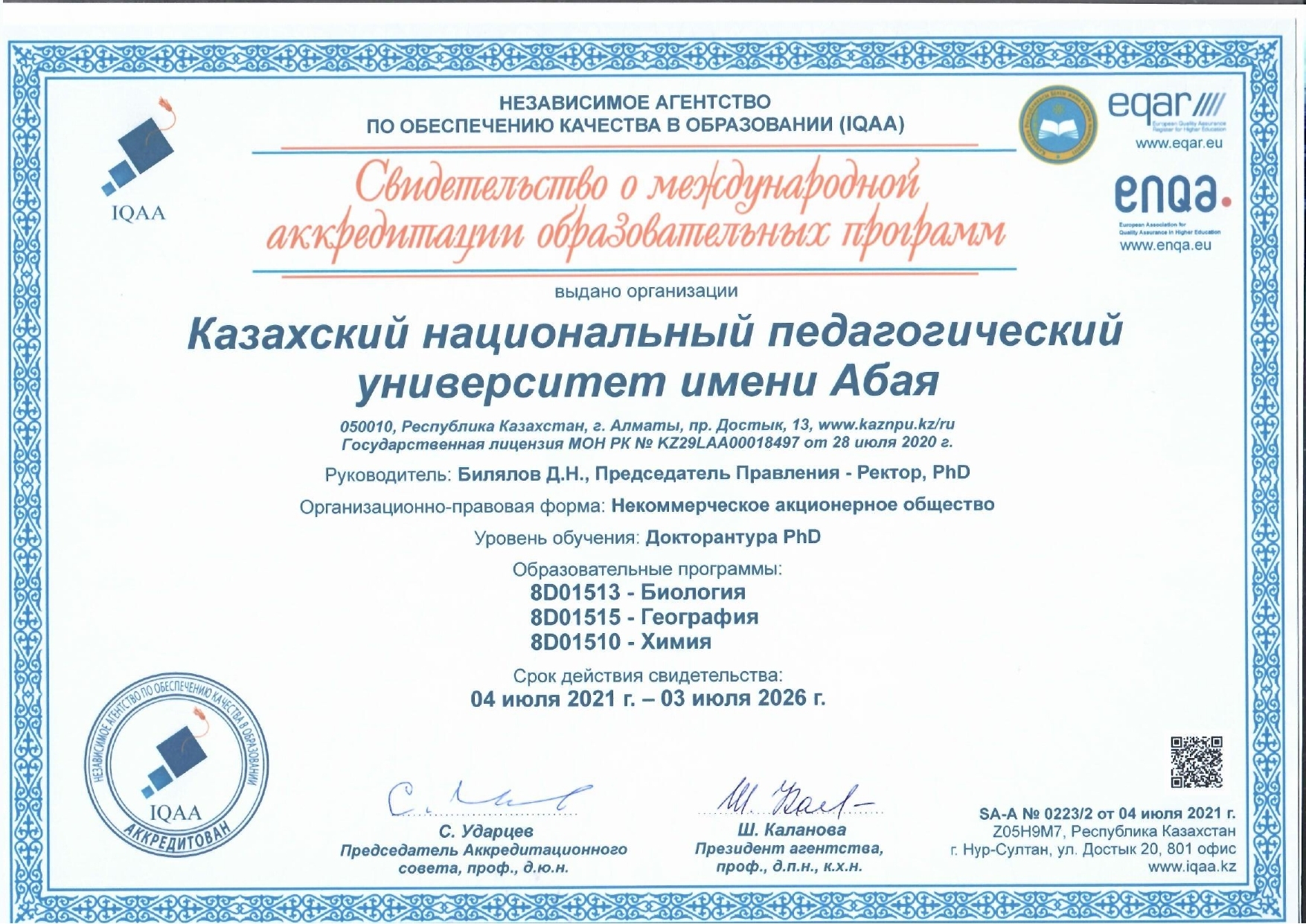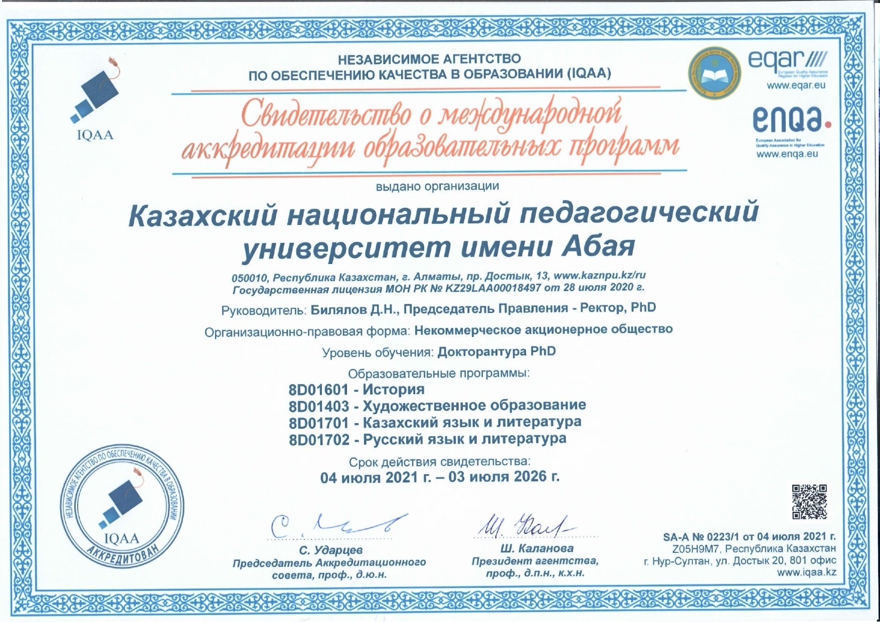 КазНПУ имени Абая в 2020, 2021 и 2024 годах успешно прошел программную (специализированную) аккредитацию в Независимом агентстве по обеспечению качества в образовании (IQAA) сроком на 5 лет.