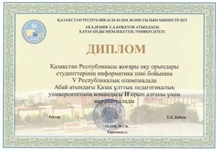 Информатика бойынша студенттік олимпиада жеңімпаздары Е.Бөкетов атындағы Қарағанды мемлекеттік университетінде 2013 жылдың 10-12 сәуір аралығында Қазақстан Республикасы жоғары оқу орындары студенттерінің арасында информатика пәні бойынша V Республикалық студенттік олимпиада өткізілді. Олимпиадаға Абай атындағы Қазақ Ұлттық педагогикалық университетінің командасы қатысып, ІІ орын алғаны үшін ІІ дәрежелі дипломмен марапатталды. Команда мүшелері «5В011100-Информатика» мамандығының студенттері Гибнер Андрей, Баелова Хадиша, Даутбаев Жәнібек. Олимпиадаға қатысушылар мен команда жетекшілерін ҚҰТТЫҚТАЙМЫЗ!