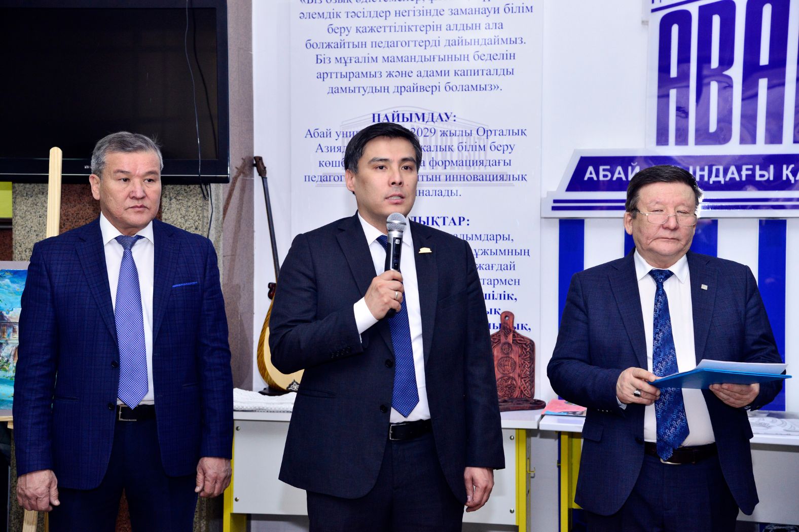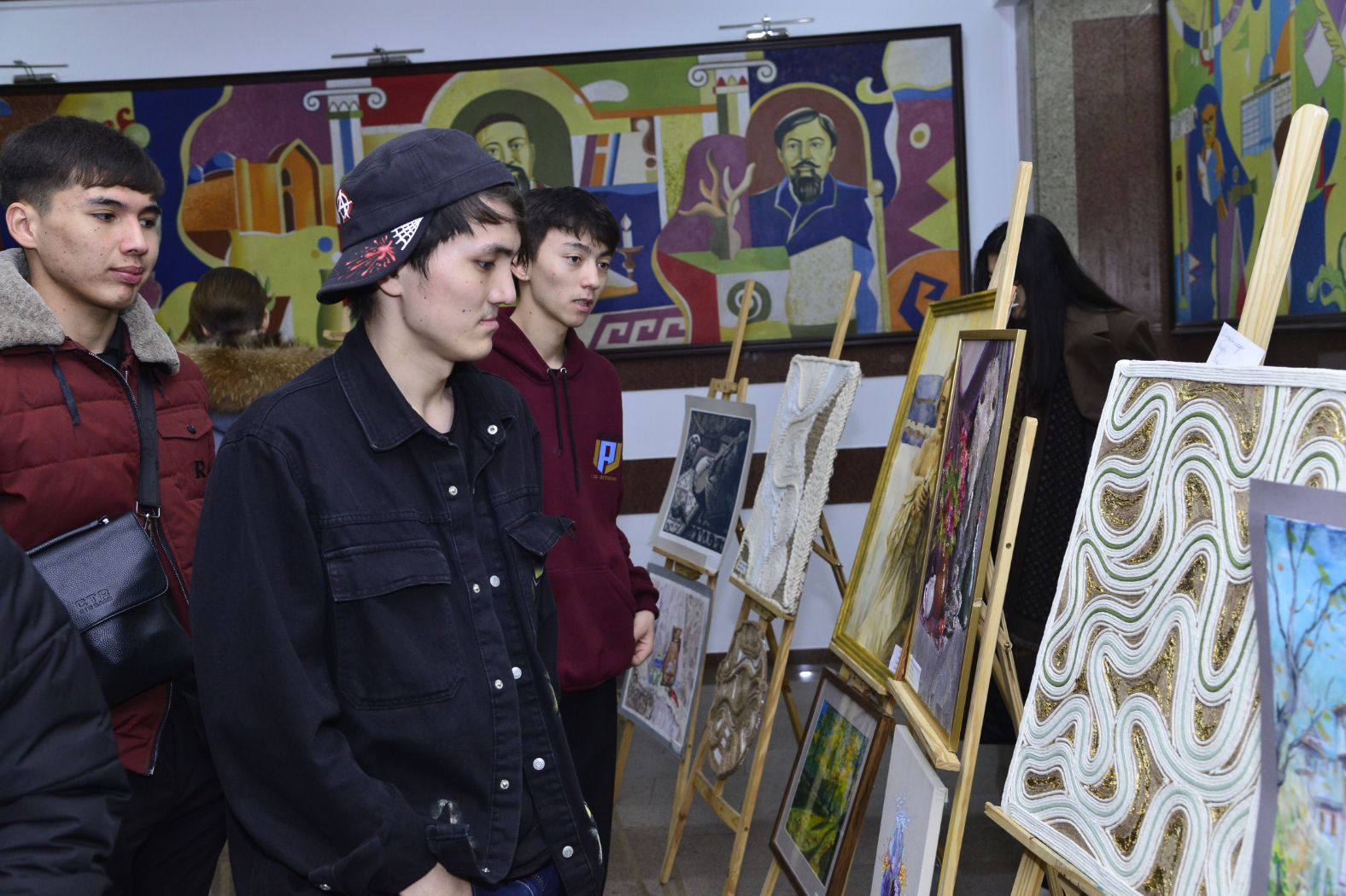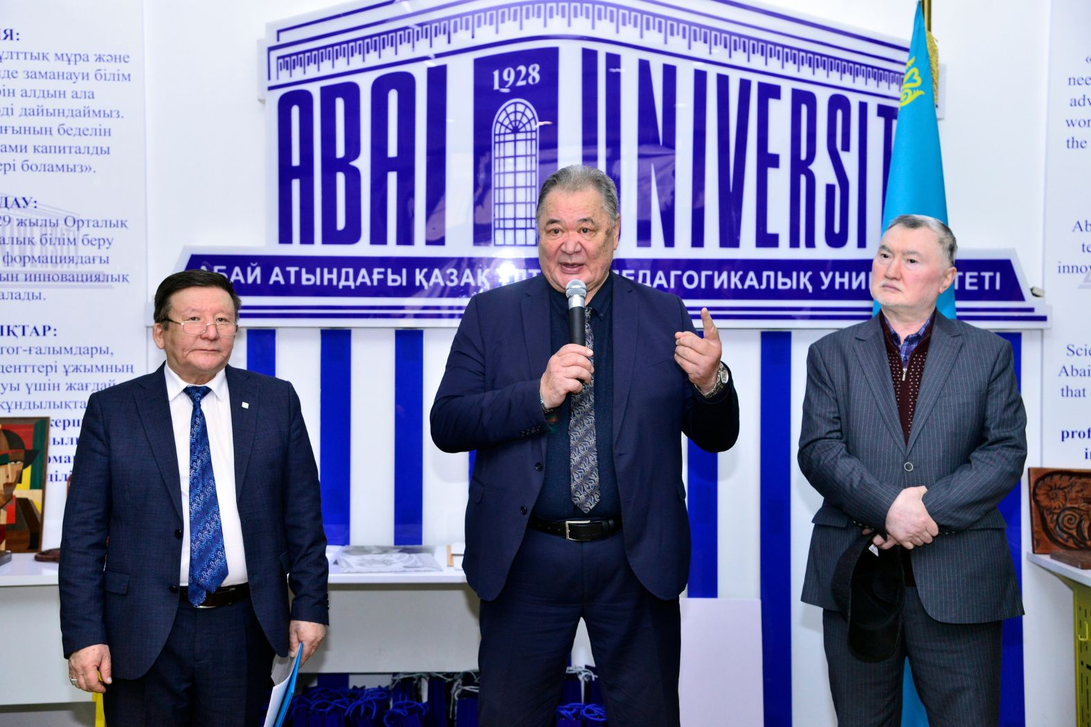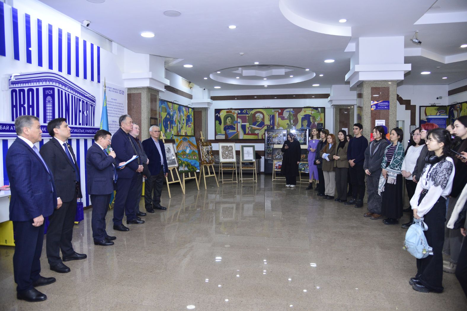 Выставка началась с Гимна Республики Казахстан и была открыта приветственным словом проректора по вопросам социального развития вуза Максата Жакауова. Затем выступили председатель Совета ветеранов Берикжан Альмухамбетов, главный редактор газеты «Абай университетi» Болат Шарахымбай, заведующий кафедрой художественного образования Ерлан Асембайулы.