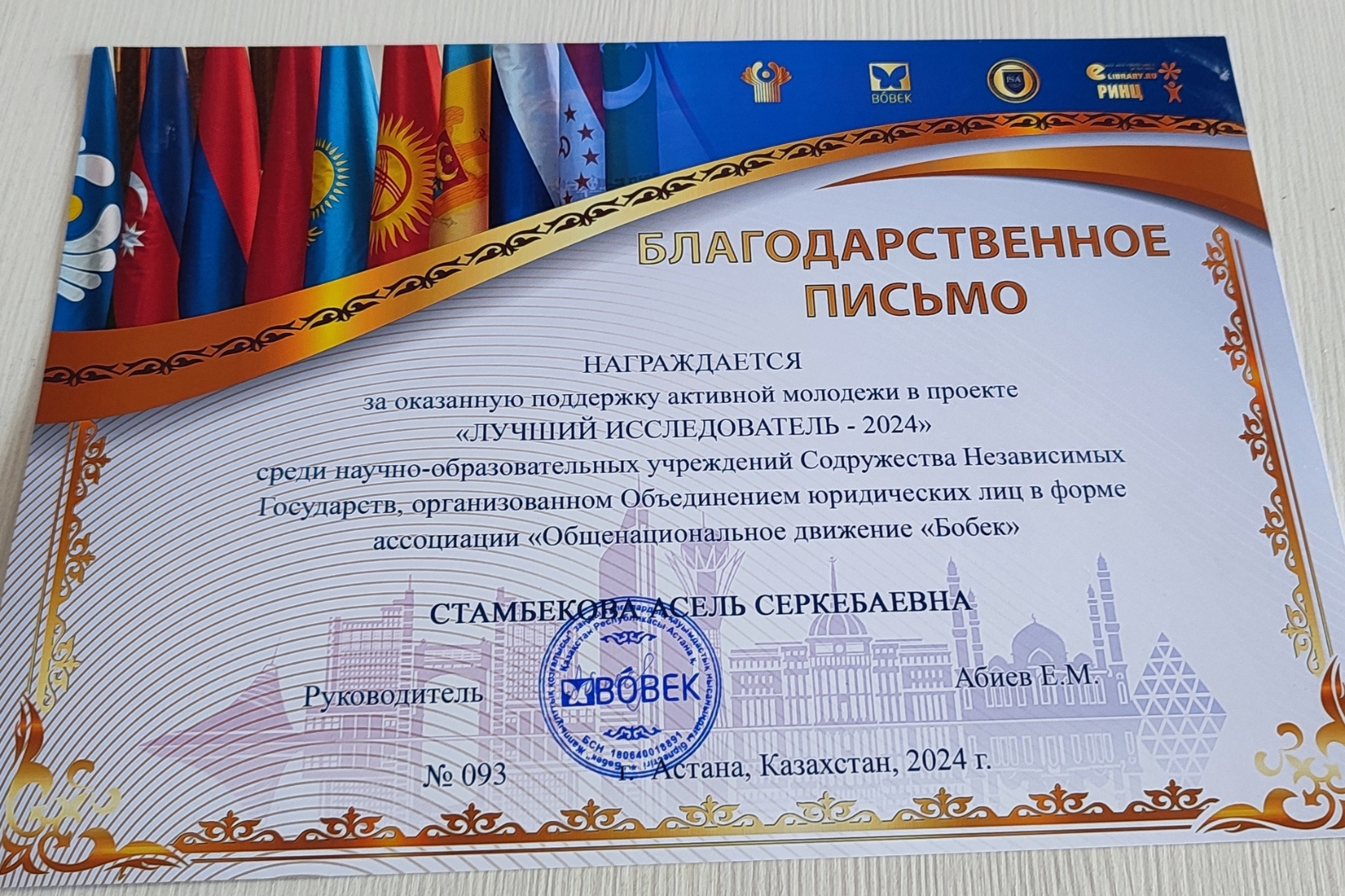 22.04.2024 Магистрант 1 курса Abai University - лучший исследователь СНГ-2024 Магистрантка 1-го курса Института педагогики и психологии Abai University (кафедра начального образования, специальность «7М01301 педагогика и методика начального обучения») Сулейменова Рабига одержала победу в конкурсе «Лучший исследователь СНГ-2024» среди научно-образовательных учреждений Содружества Независимых Государств, организованном Объединением юридических лиц в форме Ассоциации «Общенациональное движение «Бобек».