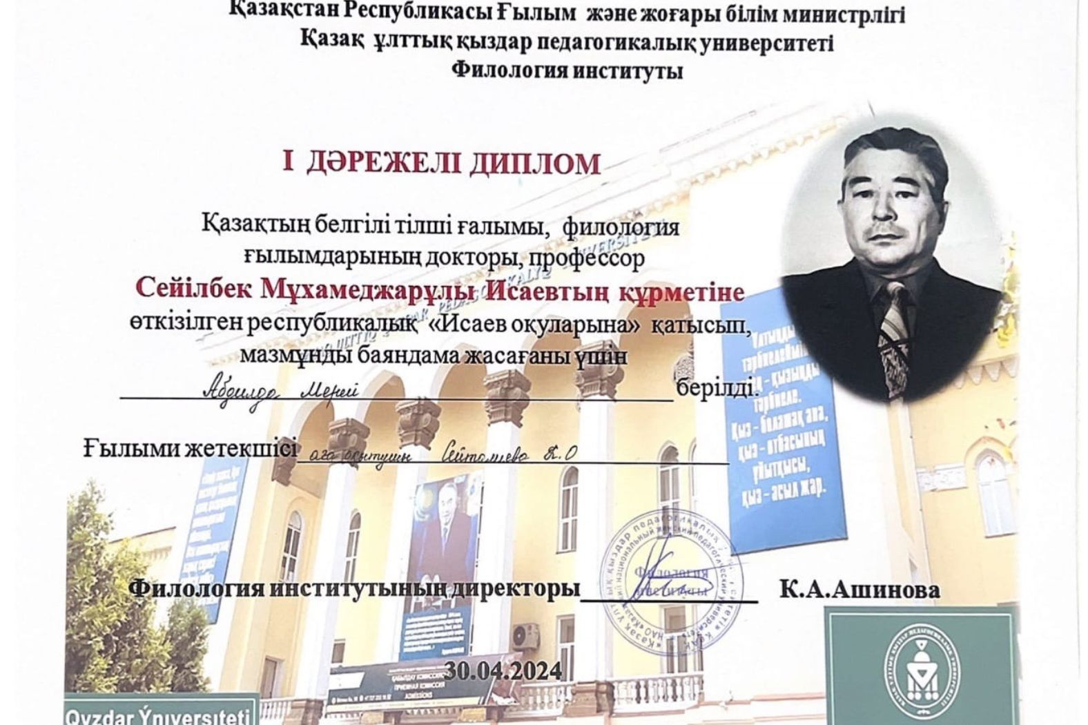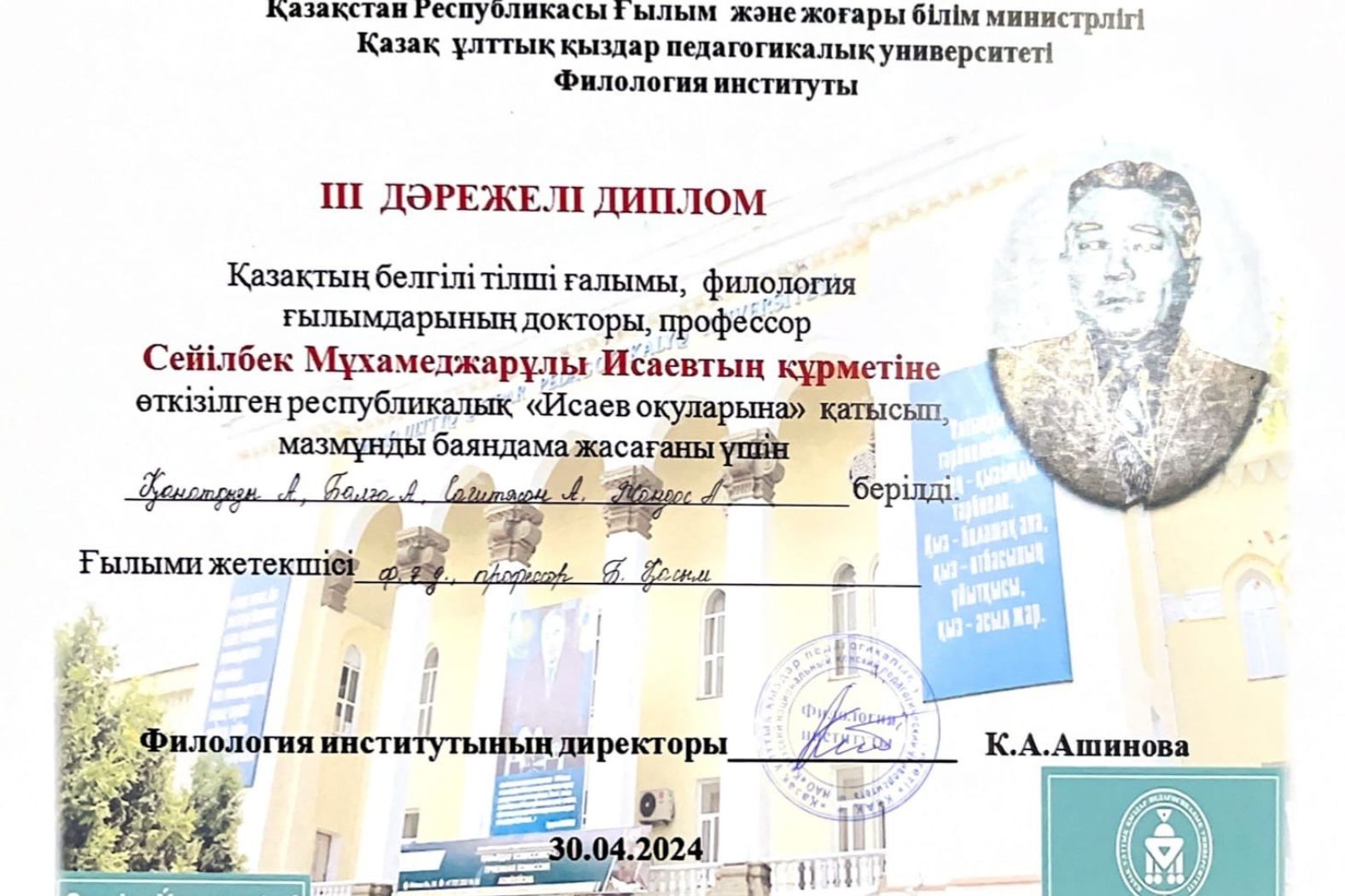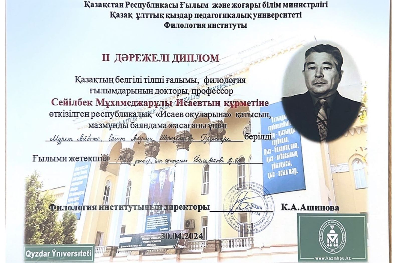 03.05.2024 Взяли призовые места в «Исаевских чтениях» В Казахском национальном женском педагогическом университете прошли республиканские «Исаевские чтения» в честь известного казахского ученого-корреспондента, доктора филологических наук, профессора С. М. Исаева.