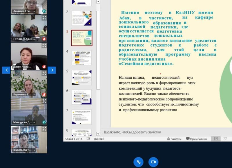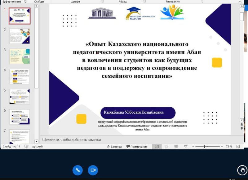 От имени КазНПУ приняли участие профессорско-пропедавательский состав факультета Педагогики и психологии - д.п.н., профессор Аренова А.Х., к.п.н, профессор Акпаева А.Б., PhD, ассоцированный профессор Абитова Г.Т., PhD, ассоцированный профессор Алимбекова А.А., PhD, ассоцированный профессор Ниетбаева Г.Б., д.п.н., профессор Аганина Қ.Ж., к.псих.н. Надирбекова А.О., ученый секретарь УМО РУМС при КазНПУ имени Абая Асымова Д.Б.. С докладом выступила заведующий кафедрой дошкольного образования и социальной педагогики, к.п.н., профессор Киякбаева Улболсын Козыбаевна на тему: «Опыт Казахского национального педагогического университета имени Абая в поддержке и сопровождении семейного воспитания».