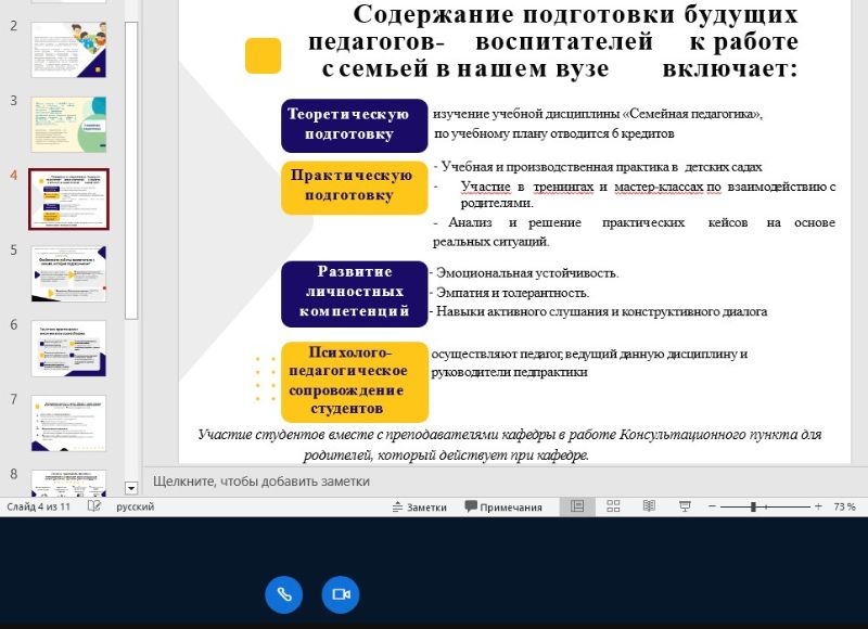 В ходе круглого стола были обсуждены опыт, методы и инновационные подходы в работе с родителями. Подняты актуальные темы как воспитание детей, ментальность семьи, баланс практикоориентированности и научно-методического содержания, социальное партнерство педагогического университета и семьи: нацеленность на развитие, о подходах к обеспечению готовности будущих педагогов к взаимодействию с родителями на основе учётов затруднений и запросов субъектов взаимодействия и так далее.