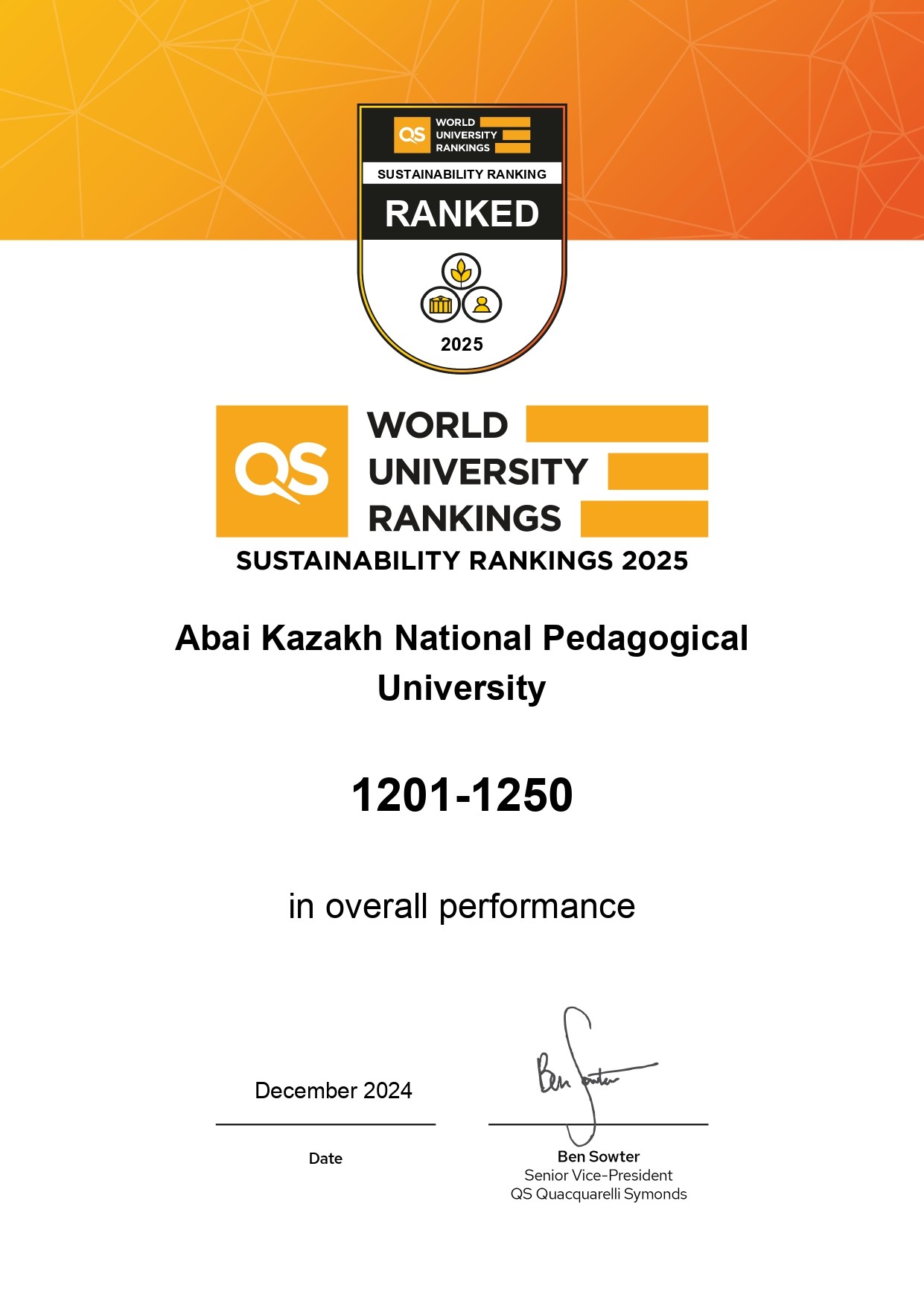 КазНПУ им. Абая на 6 месте по Казахстану, на 404 -по Азии и на 1201-1250 -на глобальном уровне. Участвуя в этом рейтинге университет демонстрирует приверженность целям устойчивого развития и в перспективе намерен улучшать результаты по трем линзам: влияние на окружающую среду, социальное воздействие и модель управления.