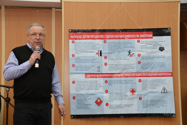 В целях выработки навыков и грамотных действий к тренировке были привлечены студенты и преподаватели Института филологии и полиязычного образования. До участников был доведен порядок действий при угрозе возникновения землетрясения и после сильного землетрясения. Проведена тренировка по эвакуации студентов из аудиторий университета в безопасное место.