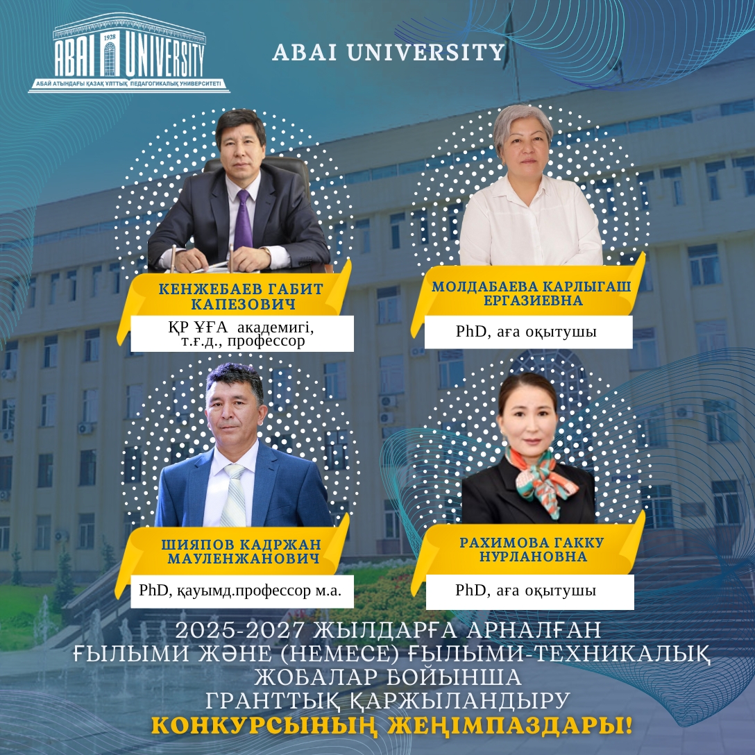 28.07.2025 Учёные Abai University - победители конкурса на грантовое финансирование научных и научно-технических проектов Учёные Abai University стали победителями конкурса на грантовое финансирование научных и научно-технических проектов на 2025-2027 годы.