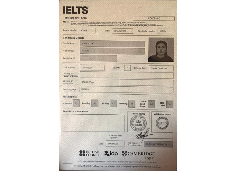 Студенты образовательных программ 6В01304 - Начальное образование с полиязычием и 6В01306 - Начальное образование на английском языке демонстрируют высокие результаты в изучении иностранных языков. Так, студентка 4 курса Маратқызы Наргиз успешно сдала международный экзамен IELTS с результатом 6.0, что подтверждает эффективность программы полиязычия в подготовке будущих учителей начальных классов.