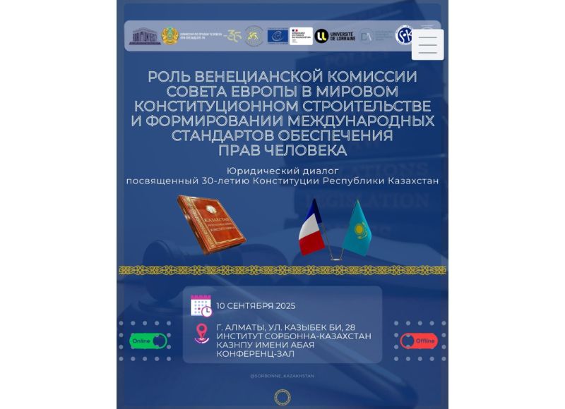 10 сентября 2025 года на платформе Института Сорбонна-Казахстан и филиала Университета Лотарингии при КазНПУ имени Абая состоится Юридический диалог, приуроченный к 30-летию Конституции Республики Казахстан. Тема мероприятия: «Роль Венецианской комиссии Совета Европы в мировом конституционном строительстве и формировании международных стандартов обеспечения прав человека».