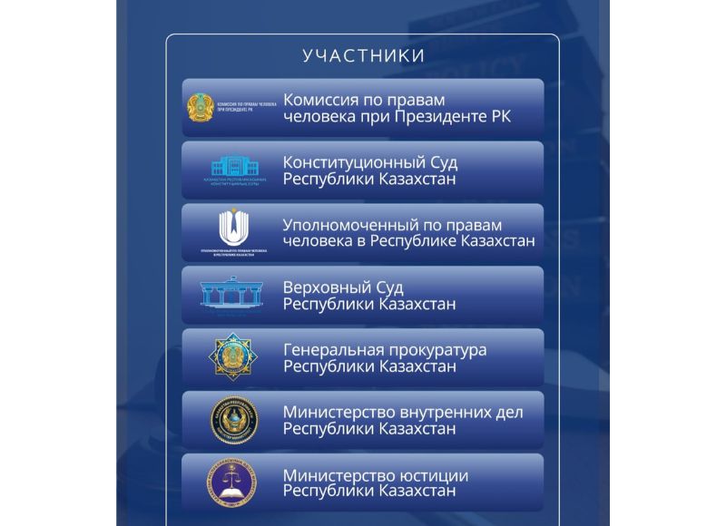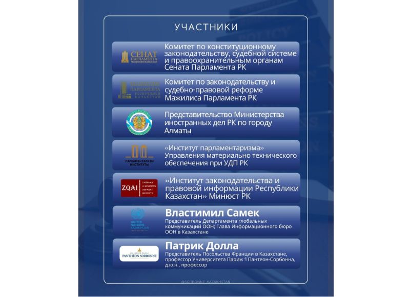 В работе диалога примут участие руководители Конституционного Суда РК, Верховного суда РК, Генеральной прокуратуры РК, Министерства юстиции РК, Министерства внутренних дел РК, парламентских комитетов по законодательству и правовым реформам, Уполномоченный по правам человека в Республике Казахстан, представительство МИД РК в Алматы, а также представители ООН, ведущие юристы Франции и научная общественность страны.