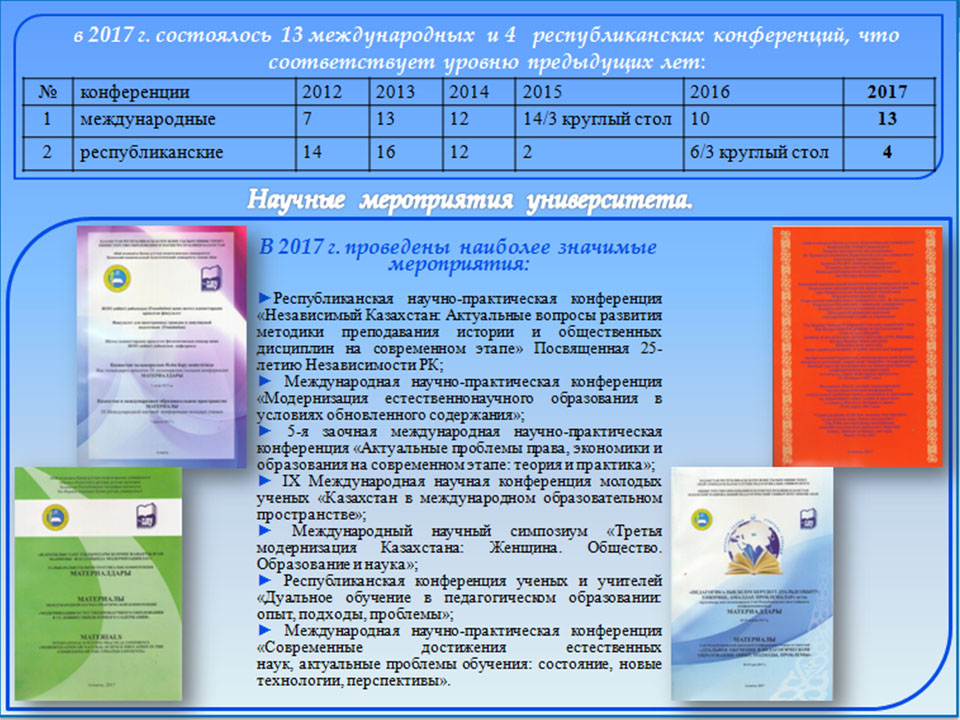 В 2017 г. проведены наиболее значимые мероприятия: Республиканская научно-практическая конференция «Независимый Казахстан: Актуальные вопросы развития методики преподавания истории и общественных дисциплин на современном этапе», посвященная 25-летию Независимости РК; международная научно-практическая конференция «Модернизация естественнонаучного образования в условиях обновленного содержания»; 5-я заочная международная научно-практическая конференция «Актуальные проблемы права, экономики и образования на современном этапе: теория и практика»; ІХ Международная научная конференция молодых ученых «Казахстан в международном образовательном пространстве»; Международный научный симпозиум «Третья модернизация Казахстана: Женщина.Общество. Образование и наука»; Республиканская конференция Ученых и учителей «Дуальное обучение в педагогическом образовании: опыт, подходы, проблемы»; Международная научно-практическая конференция;«Современные достижения естественных наук, актуальные проблемы обучения: состояние, новые технологии, перспективы».