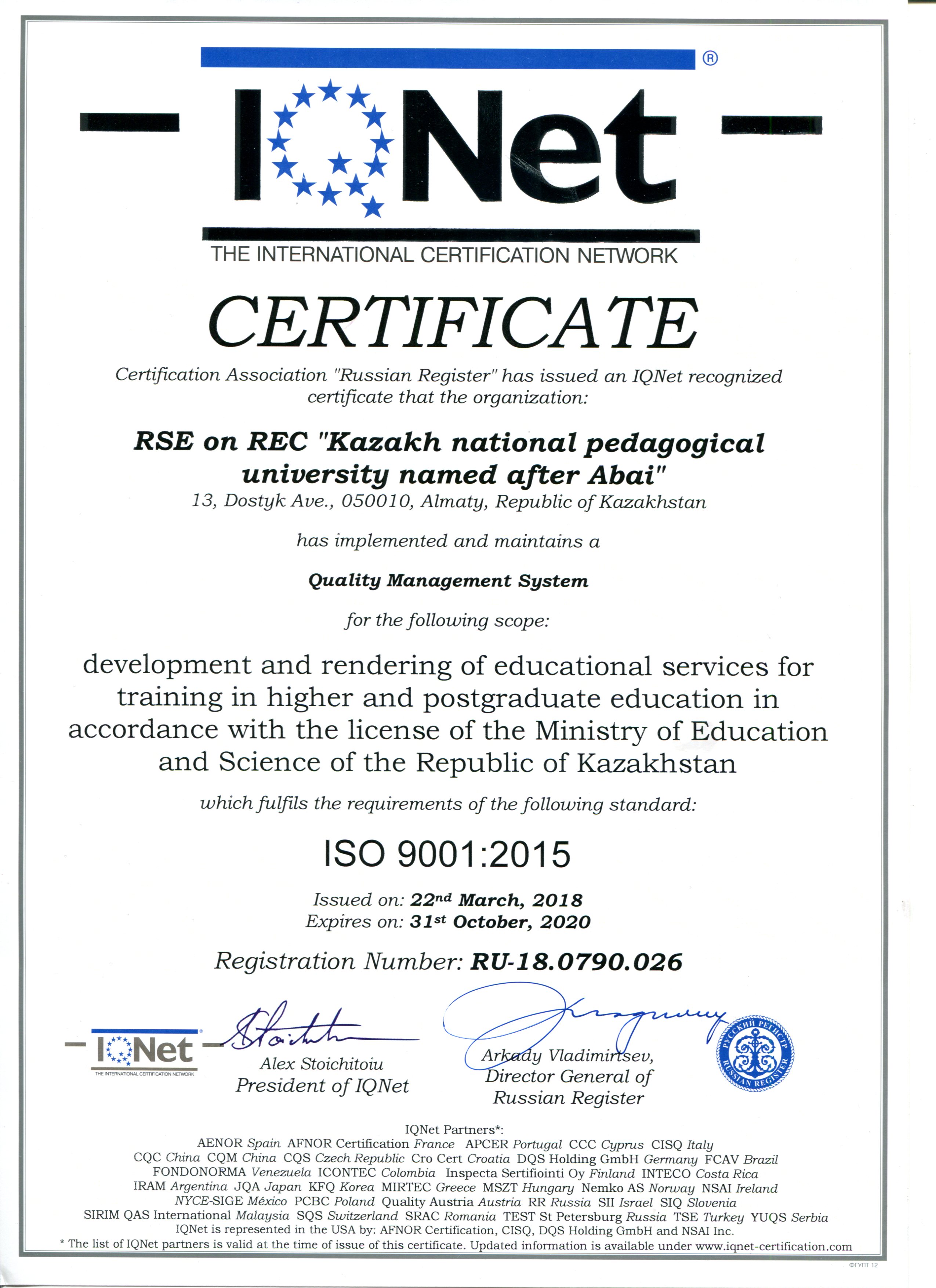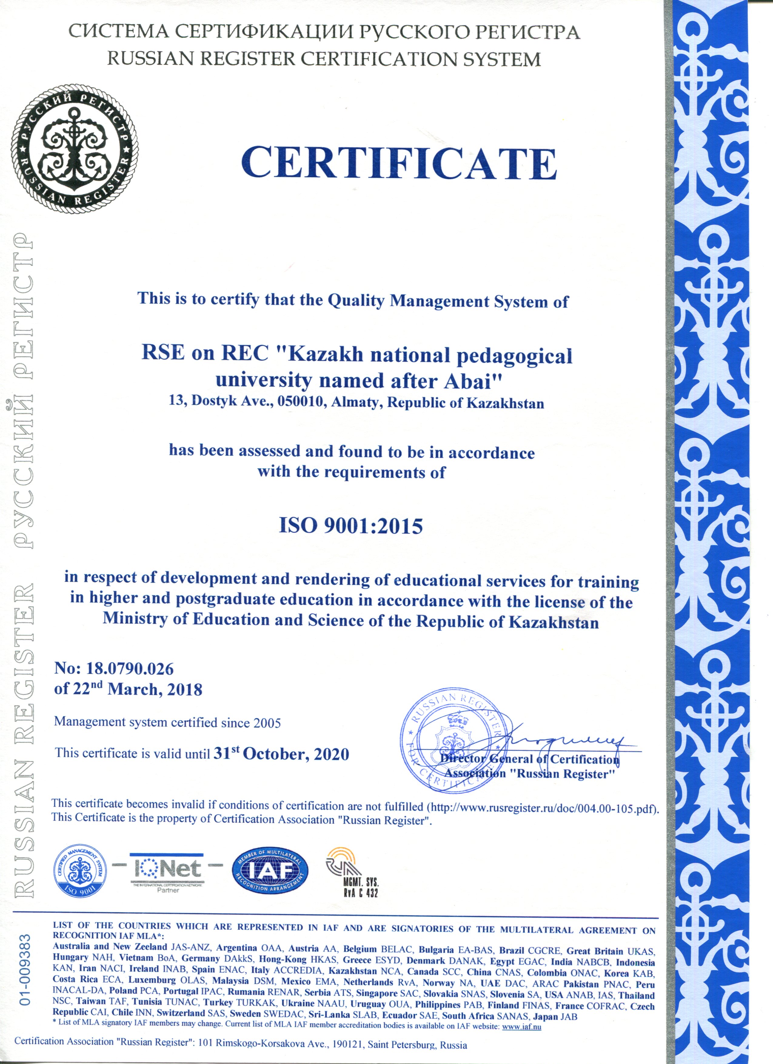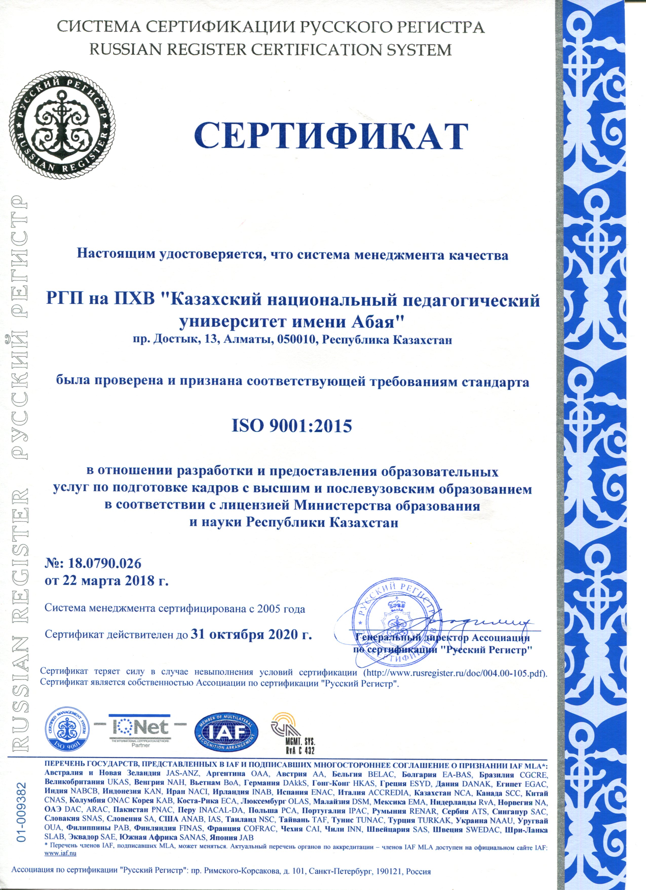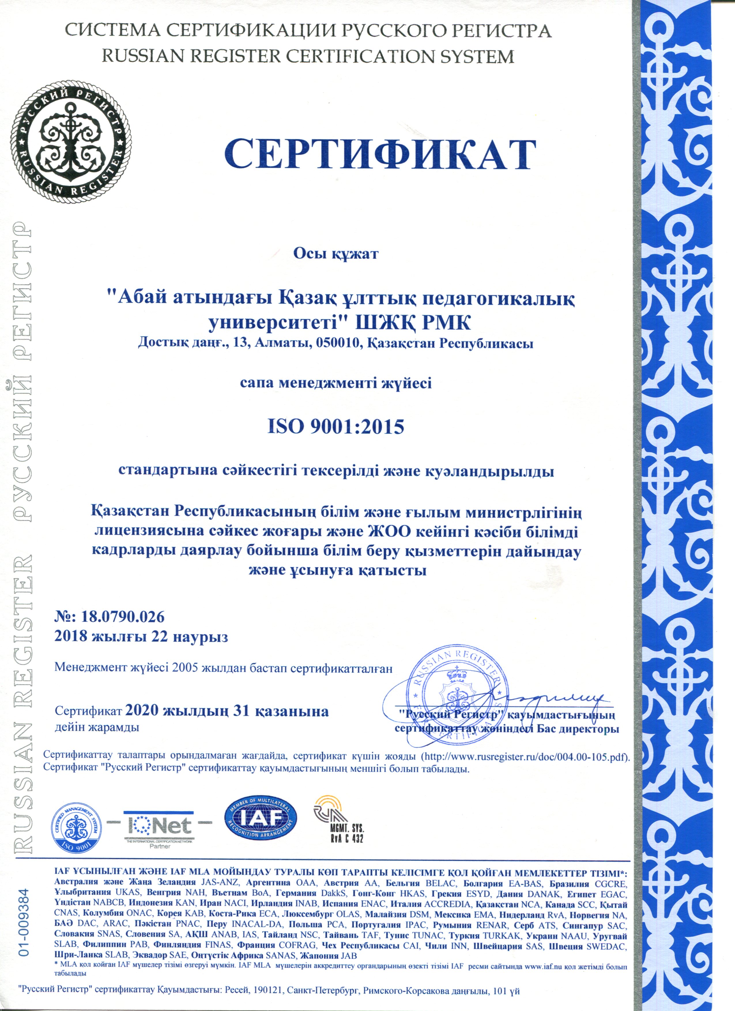 С сертификатами соответствия требованиям МС ISO 9001:2015 можно ознакомиться на официальном сайте КазНПУ имени Абая по ссылке http://www.kaznpu.kz/ru/1836/page/.