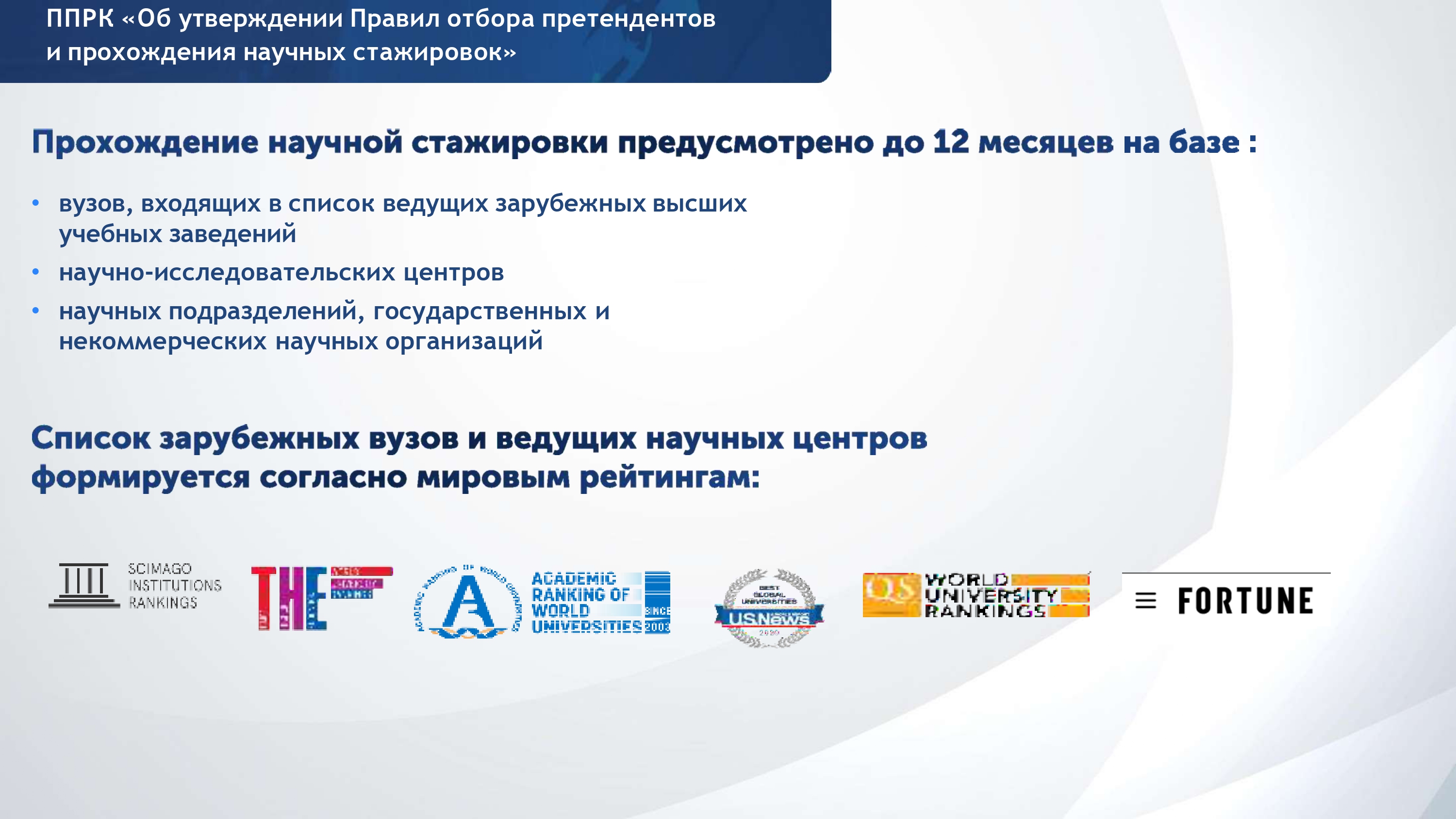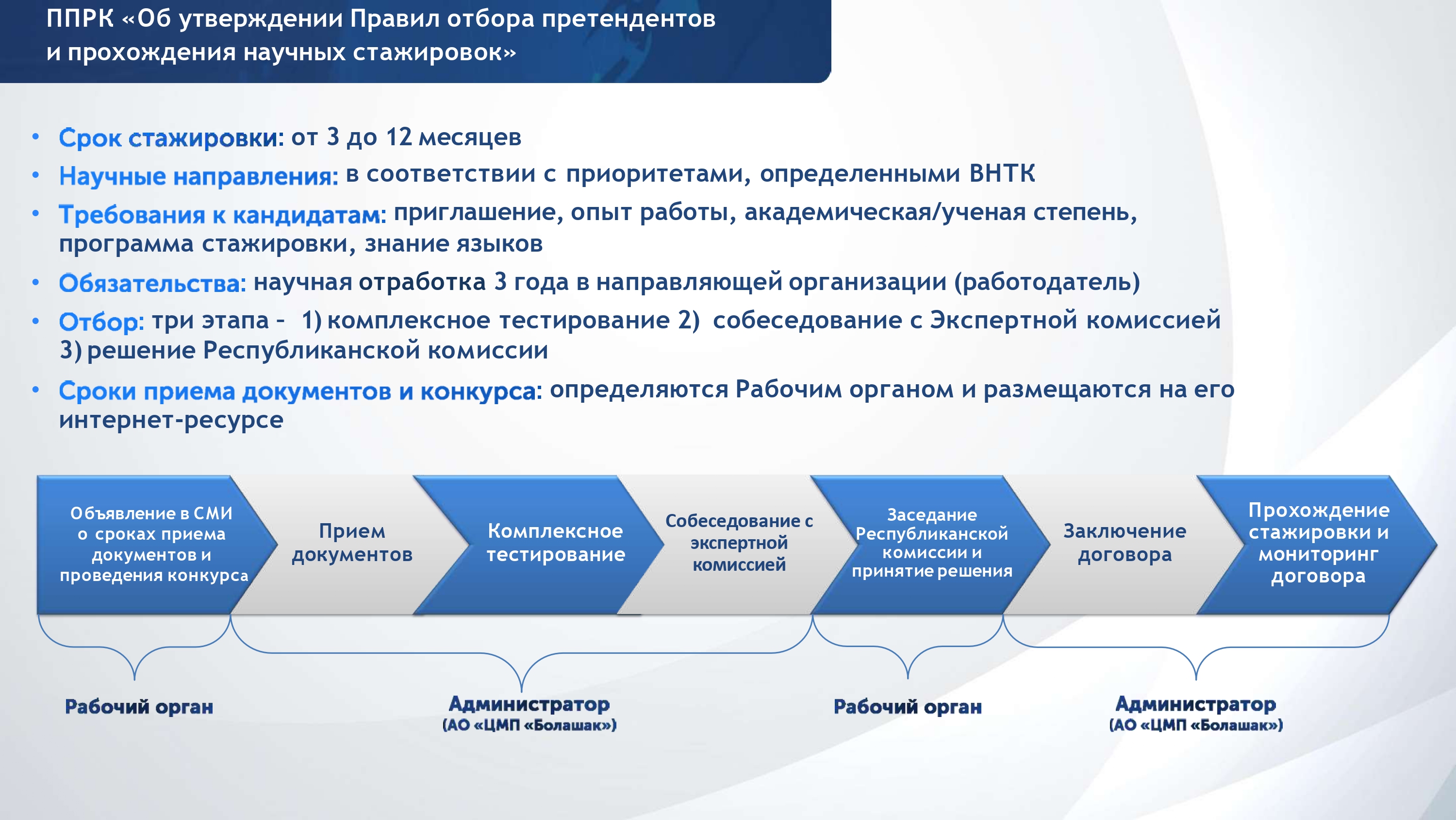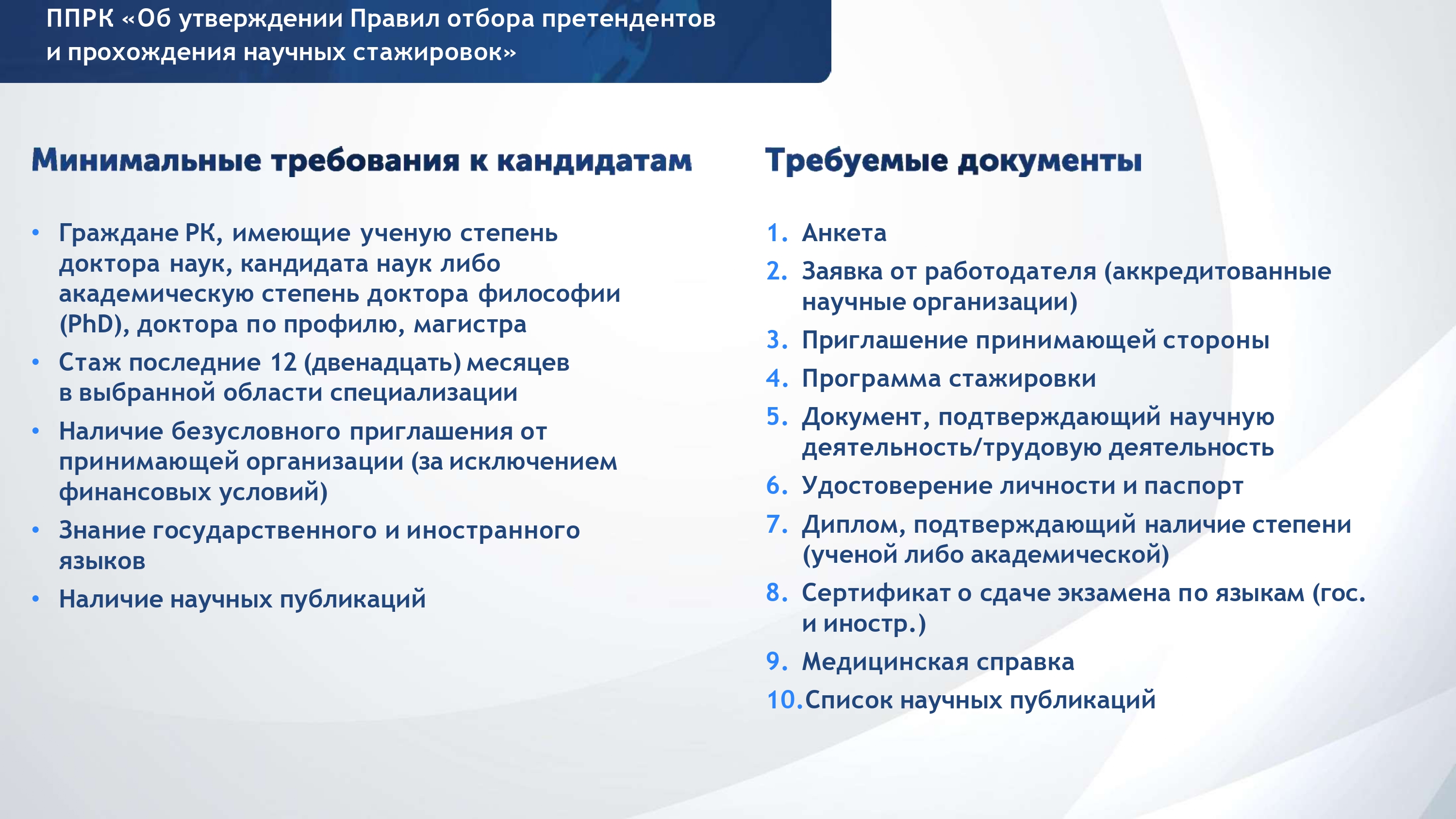 Утверждены новые правила отбора претендентов и прохождения научных стажировок! Для получения подробной информации вы можете пройти по ссылке ниже и ознакомиться с условиями. https://adilet.zan.kz/rus/docs/P2200000791