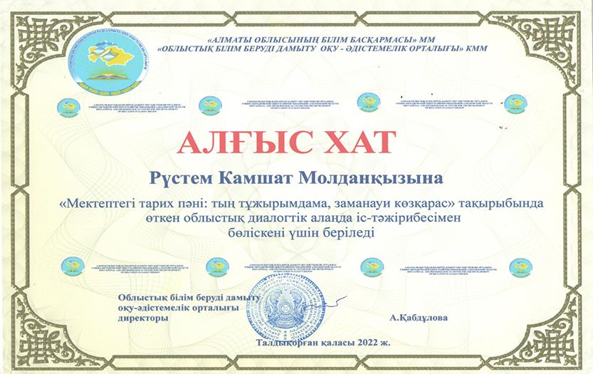 5 апреля 2022 года КГУ «Областной учебно-методический центр развития образования» ГУ «Управление образования Алматинской области» организовал областную диалоговую площадку (онлайн) на тему «Предмет истории в школе: новая концепция, современный подход».