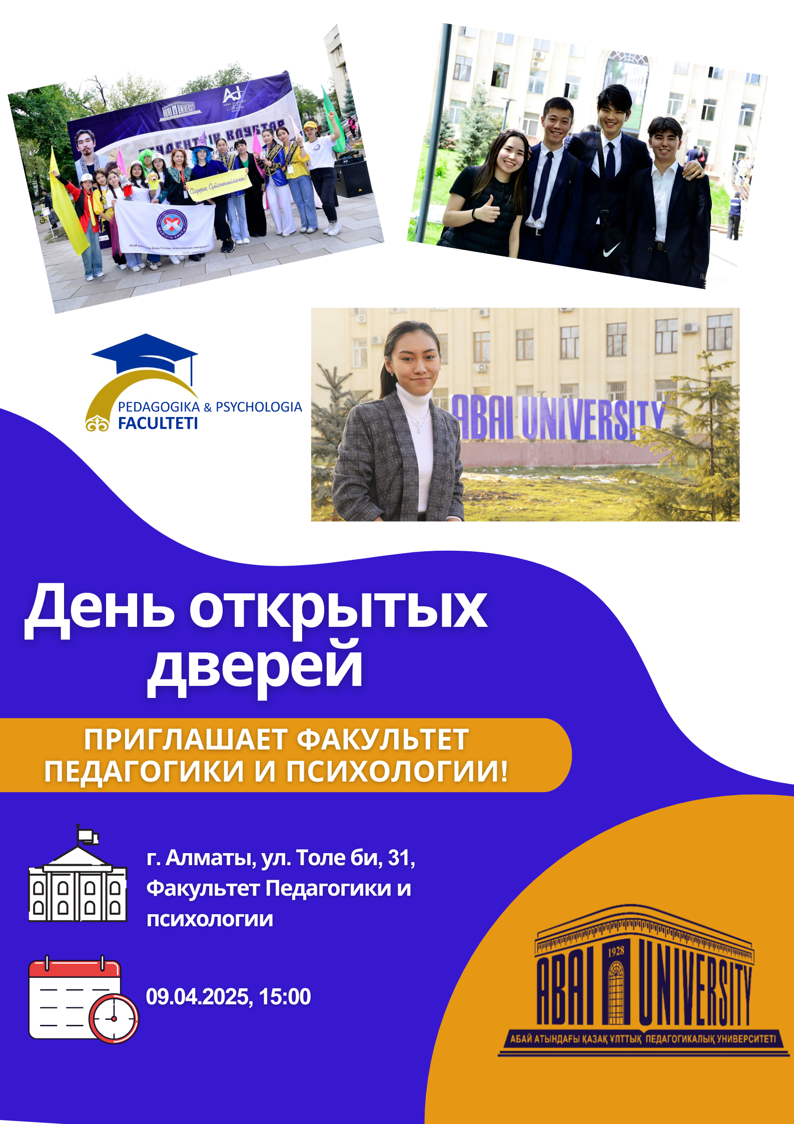 День открытых дверей-это уникальная возможность поступить в Казахский национальный педагогический университет имени Абая, узнать больше об образовательных программах факультета педагогики и психологии, получить исчерпывающую информацию по поступлению на грант и получению гранта, встретиться с преподавателями, студентами и выпускниками.