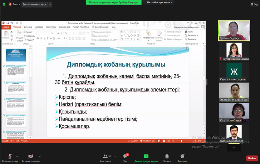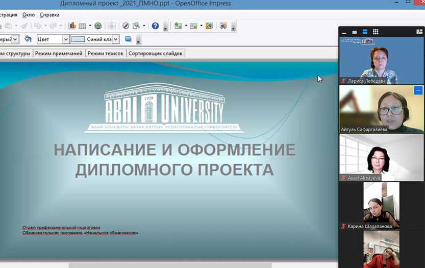 4-6 декабря 2021 года состоялись методические семинары по написанию и оформлению дипломных проектов, организованные руководителем Отдела профессиональной подготовки образовательных программ по начальному образованию Института педагогики и психологии, профессором Жумабаевой А.Е. В мероприятии приняли участие студенты выпускных курсов и их научные руководители: Абдықадыров А.О., Астамбаева Ж.Қ., Омарова Г.Ж., Қамза Г.Б., Базарбекова Р.Ж., Жұмабаева Ж, Лебедева Л.А., Рябова Е.В., Акпаева А.Б., Аренова А.Х и другие.
