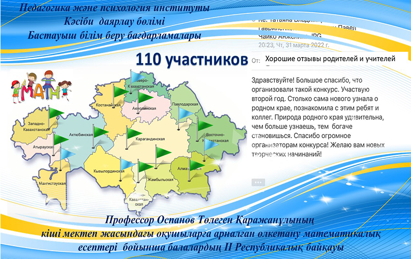 Отдел профессиональной подготовки Образовательной программы «Начальное образование» Института педагогики и психологии провел II Республиканский детский конкурс краеведческих математических задач для младших школьников имени профессора Т.Оспанова.