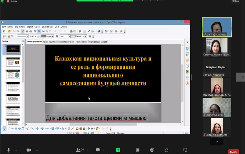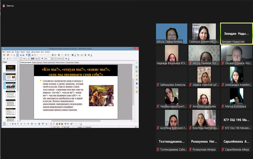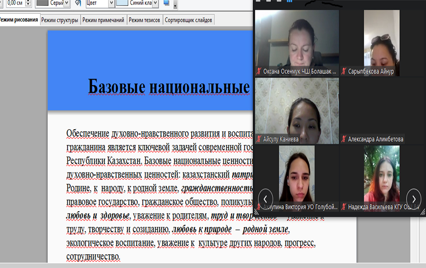 Участниками мероприятия стали учителя школ г. Алматы и Алматинской области, студенты специальности «6B01303- Начальное образование с информационно-коммуникационными технологиями». На вебинаре обсуждались актуальные проблемы базовых национальных ценностей. Говорили о национальной идее «Мәңгілік Ел», о воспитании нового казахстанского патриотизма. Особый интерес вызвали доклады, с которыми выступили С.А.Манапова (КГУ ШГ № 118, Алматы) и Н.А.Васильева (КГУ ОШ № 84, Алматы).