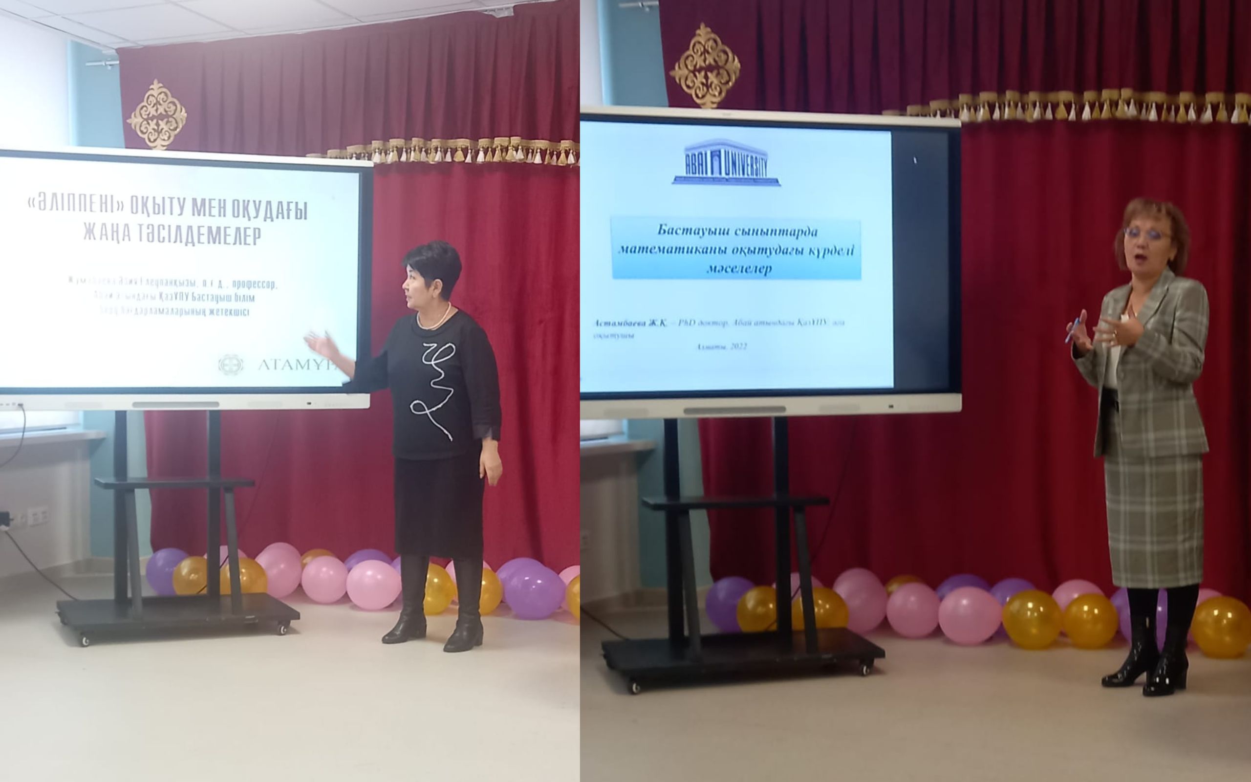 22 ноября 2022 года преподаватели кафедры начального образования КазНПУ им. Абая - д. п. н., профессор, автор учебников «Әліппе», «Қазақ тілі» Жумабаева Азия Елеупановна и PhD, старший преподаватель Астамбаева Жупат Канапьяновна провели семинар-тренинг «Пути обеспечения качественного образования по учебным предметам начальных классов» с учителями начальных классов в открывшейся в текущем учебном году школе №204, которая расположена в микрорайоне «Саялы» города Алматы. Цель семинара - повысить уровень методико-языкового и методико-математического образования учителей, а также оказать им методическую помощь.