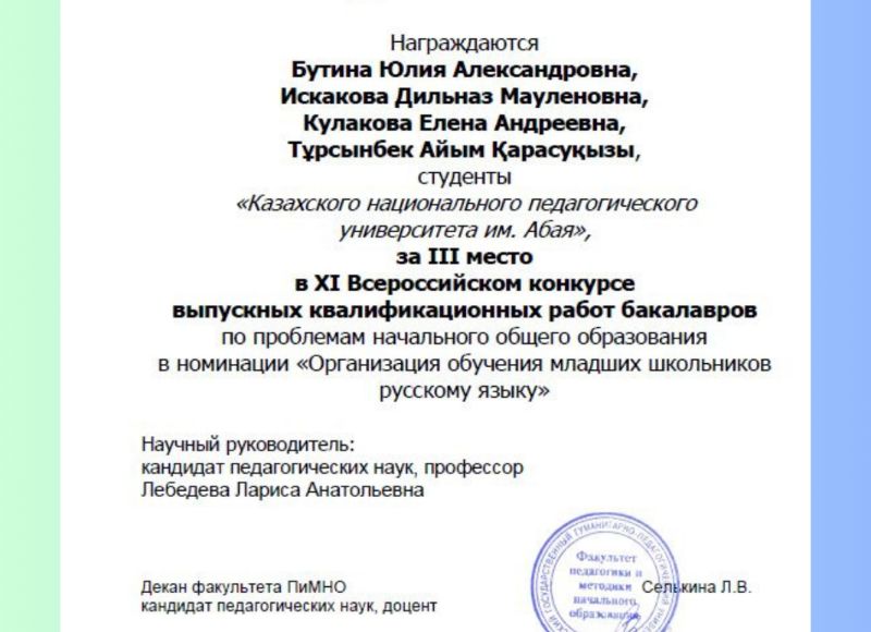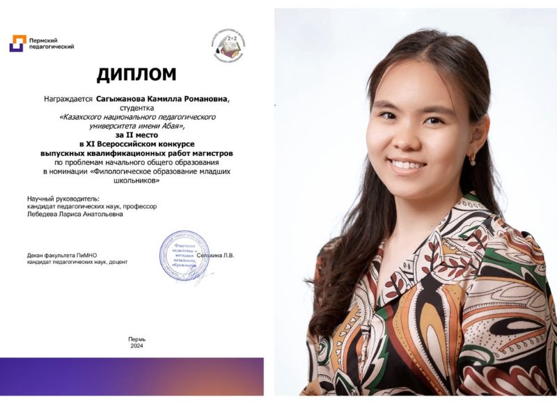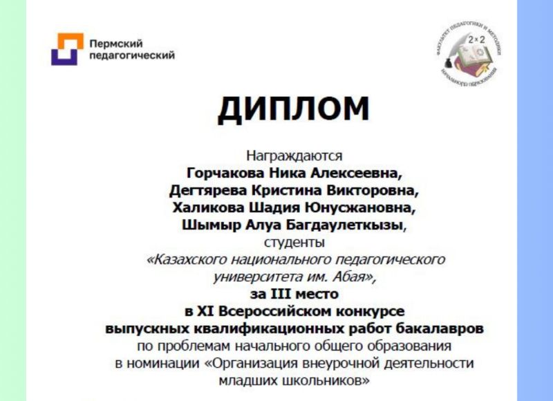 Выпускники Abai University стали призерами Международного конкурса выпускных квалификационных работ в Перми Выпускники 2024 года Факультета педагогики и психологии кафедры начального образования КазНПУ имени Абая приняли участие в XI Всероссийском конкурсе выпускных квалификационных работ (с международным участием), посвящённых проблемам начального образования. Конкурс проводился кафедрой теории и технологии обучения и воспитания младших школьников Факультета педагогики и методики начального образования Пермского государственного гуманитарно-педагогического университета (Россия) среди бакалавров и магистрантов. Целью конкурса было привлечение выпускников к реализации социальных заказов по проблемам начального образования, а также развитие навыков научно-исследовательской работы. Рассмотрение представленных работ экспертной комиссией и подведение итогов прошло с 11 сентября по 11 октября 2024 г.
